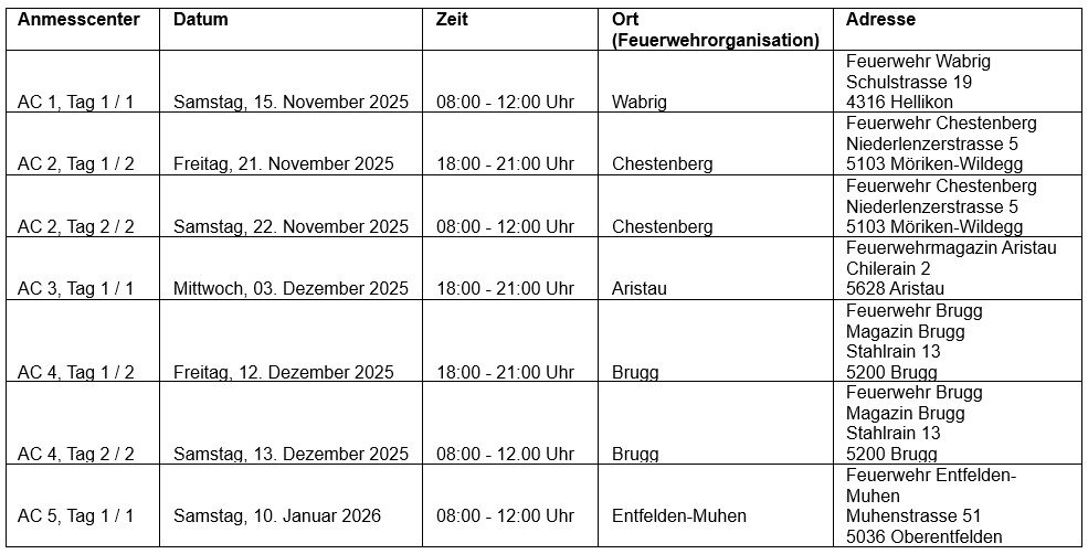 Die Reise zu TEXPORT hat uns nicht nur wertvolle Einblicke in die Herstellung und Weiterentwicklung unserer Ausrüstung ermöglicht, sondern auch gezeigt, mit wie viel Engagement und Leidenschaft unser Partner arbeitet. Es ist schön zu sehen, wie gut die Zusammenarbeit funktioniert – sowohl international mit TEXPORT als auch regional mit den Feuerwehren im Kanton Aargau. Gleichzeitig befinden wir uns mitten in einer intensiven, aber spannenden Phase der Anmesssaison 2025/26. Neben einigen Feuerwehren, die wir aktuell direkt vor Ort anmessen dürfen oder bereits durften, stehen bald auch wieder unsere zentralen Anmesscenter an. Dort werden Neueingeteilte und einzelne AdF angemessen, damit sie rechtzeitig und bestens für die Einführungskurse ausgerüstet sind. Die Termine und Orte sind auf dem Bild unten ersichtlich.