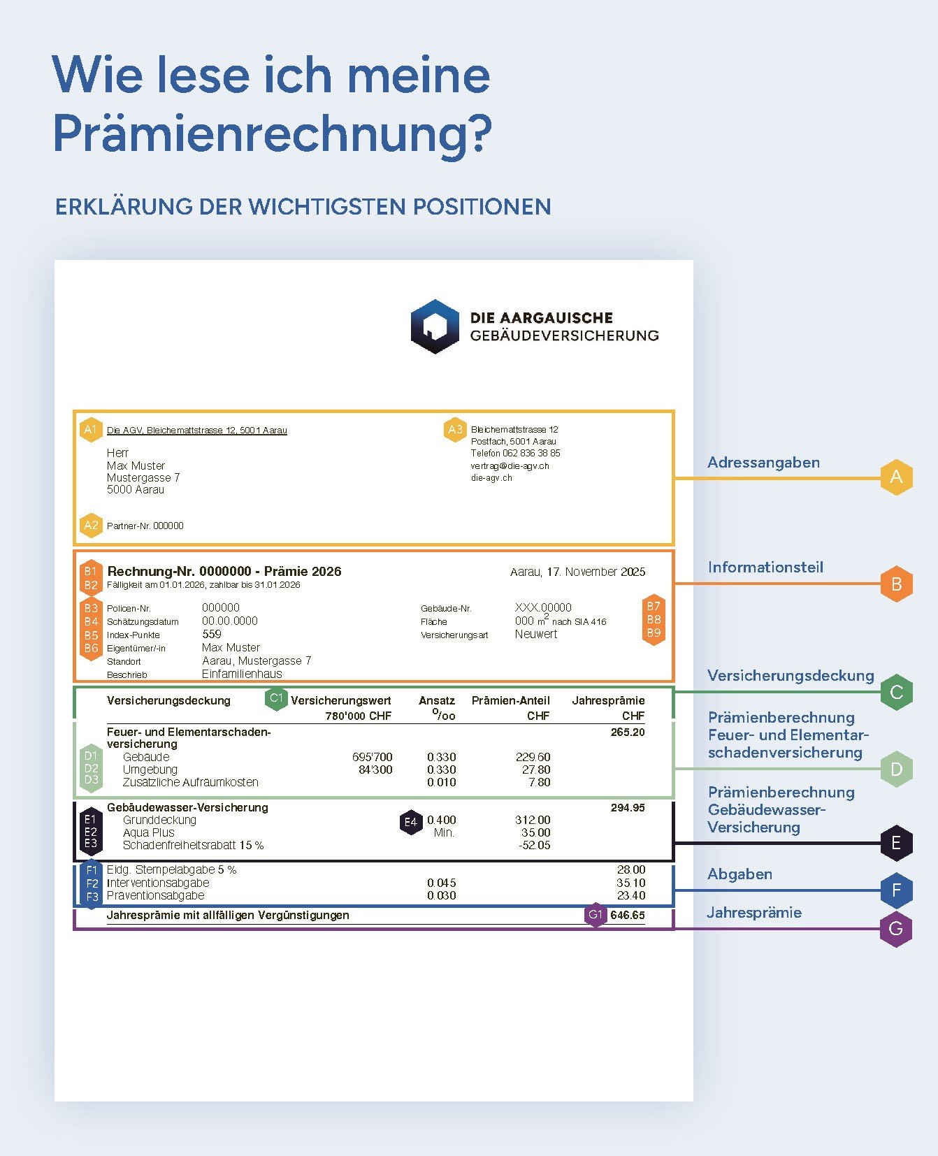 Hier erfahren Sie, wie Ihre Prämienrechnung der Aargauischen Gebäudeversicherung aufgebaut ist und was die einzelnen Positionen bedeuten.
